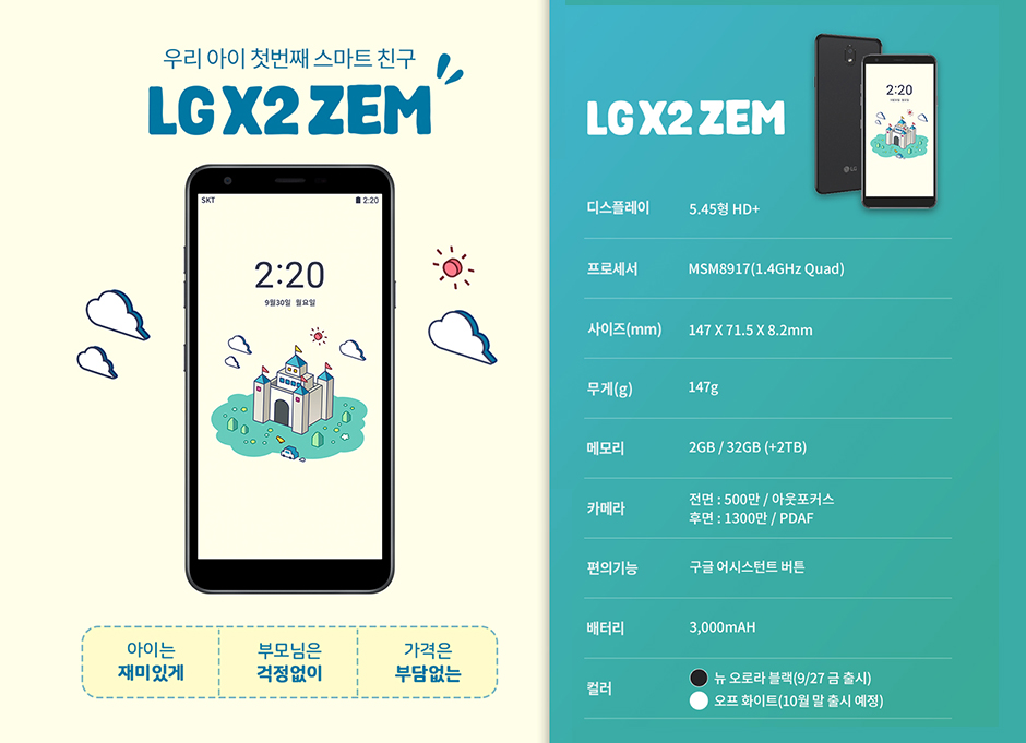 이번에는 ZEM 요금제와 함께 사용하기 좋은 스마트폰을 알아보겠습니다. 최근 LG X2, LG X4, 갤럭시 A10e, 갤럭시 A30 등 초등학생이 사용하기 좋은 스마트폰 라인업이 확대됐는데요. 그 중에서 지난 10월 출시된 키즈 전용 스마트폰 ‘LG X2 ZEM’은 자녀의 첫 스마트폰으로 적합합니다. 가로 71.5mm, 세로 147mm, 두께 8.2mm의 콤팩트한 크기와 147g의 가벼운 무게로 초등학교 저학년도 한 손으로 사용하기에 무리가 없습니다. 여기에 5.45인치 HD+ 디스플레이, 자동초점 기술이 적용된 카메라, 3000mAh 배터리를 장착해 어른이 사용해도 될 정도의 스펙을 갖췄습니다. 삼성전자 A10e 역시, 가로 69.7mm, 세로 147.4mm의 콤팩트한 사이즈에 인피니트-V 디스플레이, 800만 화소 카메라 등을 갖춰 초등학생 자녀를 위한 스마트폰으로 추천합니다.