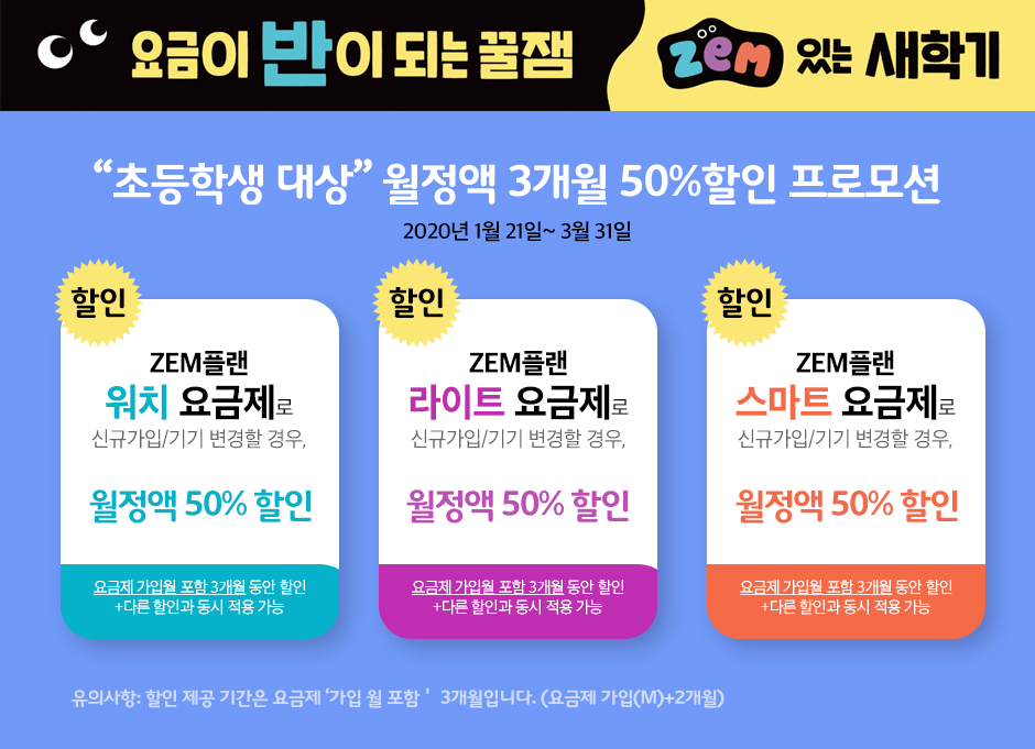 잼(ZEM)이 신학기를 맞아 반값에 이용할 수 있는 프로모션을 진행합니다. 3월 말까지 진행하는 이번 프로모션은 잼(ZEM) 플랜 요금제 3종에 가입하는 초등학생 고객이 통신요금을 3개월간 50% 할인받을 수 있습니다. 월 8,800원의 ZEM 워치 요금제는 4,400원, 15,400원의 ZEM 라이트 요금제는 7,700원, 19,800원의 ZEM 스마트 요금제는 9,900원에 이용할 수 있죠. 신규 가입자뿐만 아니라 기기변경까지 약정 가입하는 모든 초등학생 고객은 보호자가 가입한 이동통신사에 관계없이 혜택을 받을 수 있답니다.