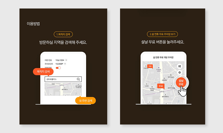 무료 주차장 안내는 설 연휴 시작 전날인 23일부터 27일까지 ‘T맵 주차’에서 제공됩니다. ‘T맵 주차’ 앱은 플레이 스토어, 앱스토어에서 내려받을 수 있습니다. 가고자 하는 목적지를 검색하면, 목적지 인근 무료 개방 공공 주차장이 앱 화면에 표시됩니다.