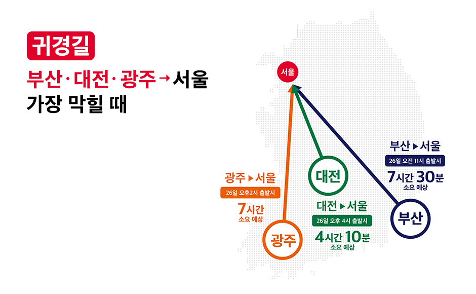 부산-서울은 26일(일) 오전 11시 출발하면 7시간 30분 소요될 것으로 분석됩니다. 대전-서울은 26일(일) 오후 4시 출발하면 4시간 10분 소요, 광주-서울은 26일(일) 오후 2시 출발하면 7시간 소요로 귀경길 정체가 이어질 예정입니다.