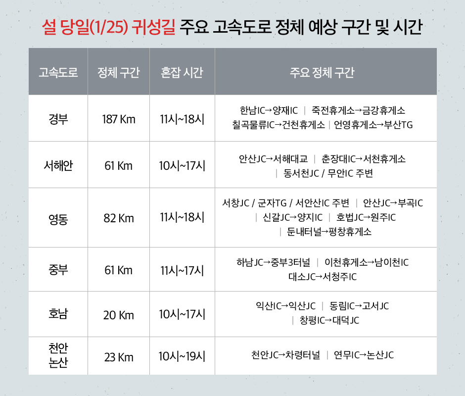설날인 25일 서울에서 출발하는 귀성길 주요 고속도로의 정체 구간과 시간을 예측한 결과, 경부고속도로는 오전 11시에서 오후 6시 사이 한남IC-양재IC, 죽전 휴게소-금강 휴게소, 칠곡물류IC-건천 휴게소, 언양 휴게소-부산TG 등 187km에 걸쳐 평균속도 50km/h 미만의 정체가 이어질 것으로 보입니다.