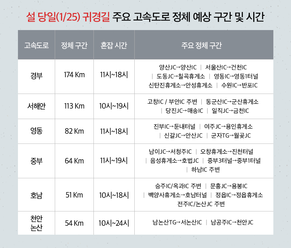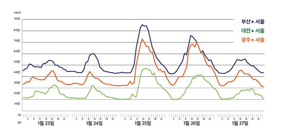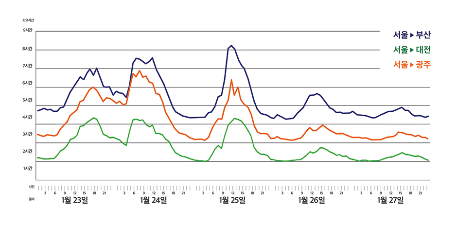 많은 분이 이용하는 서울-부산, 서울-대전, 서울-광주 고속도로는 상·하행선 모두 설날인 25일이 역귀성 차량과 나들이 차량이 몰리며 가장 혼잡할 것으로 예측됩니다.