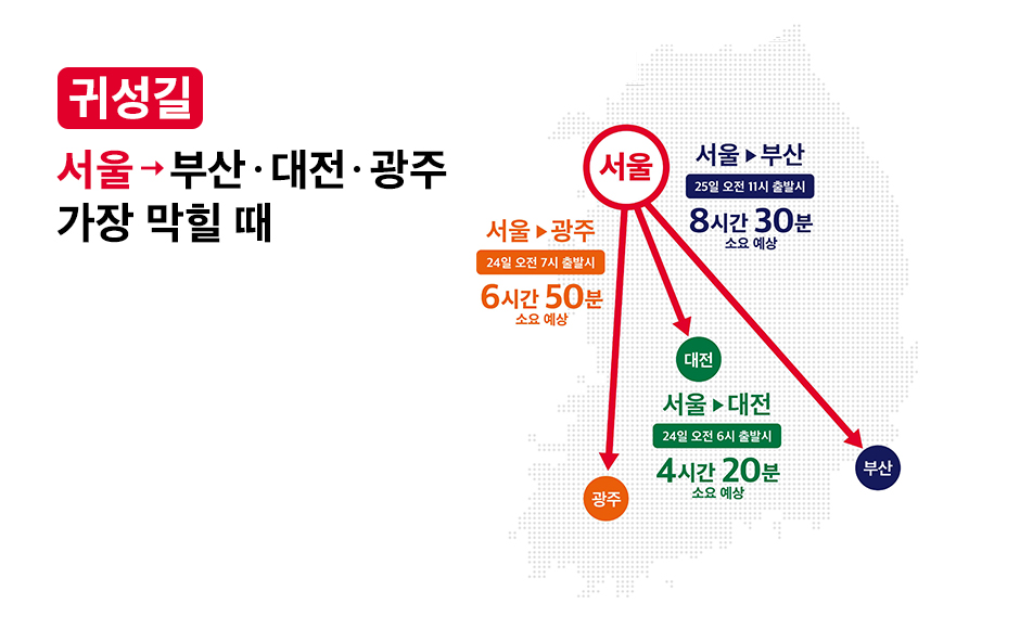 서울-부산은 상·하행 양방향 모두 8시간 이상 소요될 것으로 보입니다. 서울-대전 구간은 양방향 모두 4시간 이상, 서울-광주 구간은 상·하행선 양방향 모두 6시간 이상 소요될 예정입니다. 평상시보다 약 2~3시간 더 걸리는 셈입니다.