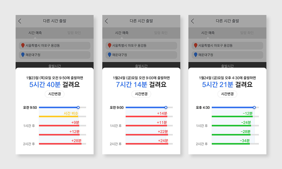 T맵 애플리케이션으로 귀성길과 귀경길 소요 시간을 미리 알아볼 수도 있습니다. T맵을 실행한 뒤 ‘다른 시간 출발’ 메뉴를 클릭하세요. 출발하는 시각과 출발지, 목적지를 입력하면 총 소요 시간을 미리 알아볼 수 있습니다.