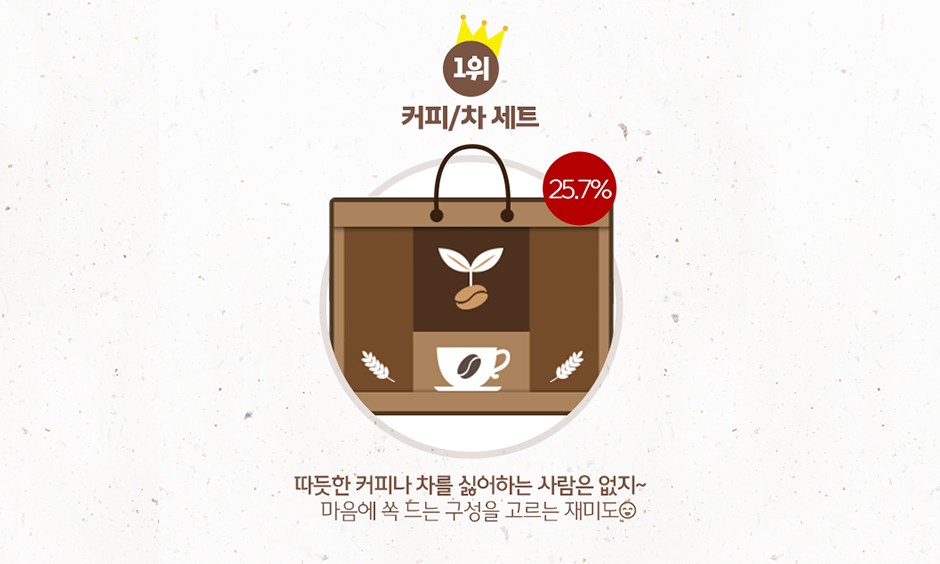 대망의 1위는 ‘커피/차 세트’가 차지했습니다. 호불호가 많이 나뉘지 않는다는 점에서 명절뿐만 아니라 두루두루 선물하기 좋은 아이템이죠. 최근에는 더치커피 원액이나 드립백 등 종류도 다양하니, 커피/차 세트로 센스 있는 선물해보세요.