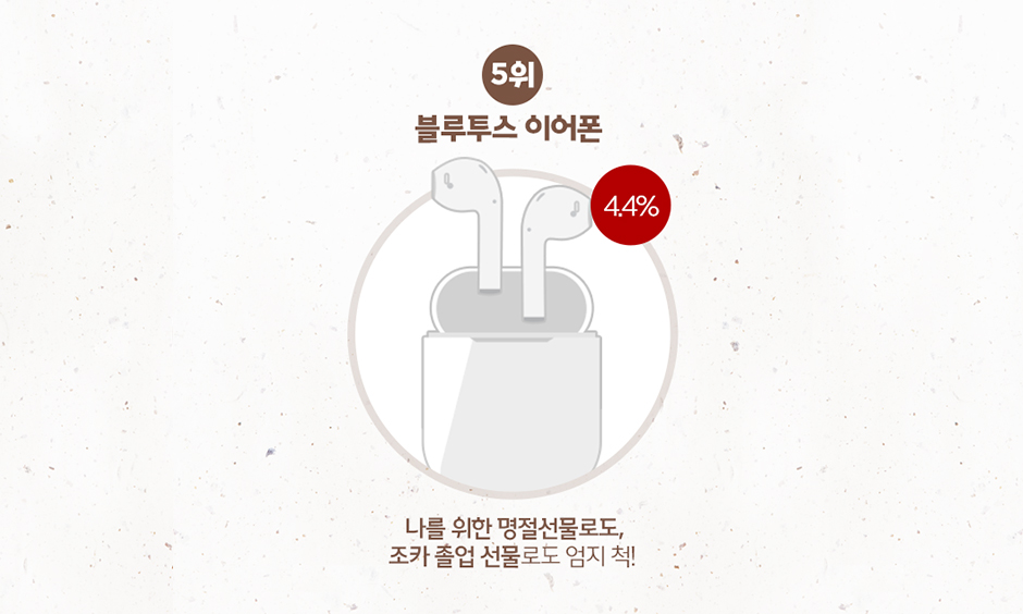 5위는 떠오르는 강자, ‘블루투스 이어폰’입니다. 블루투스 이어폰은 ‘있으면 너무 편하지만 없어도 문제는 없는’ 아이템 중 하나인데요. 요런 아이템이야말로 선물로 제격이죠. 조카의 졸업/입학 선물이나 나를 위한 명절선물로도 딱입니다.