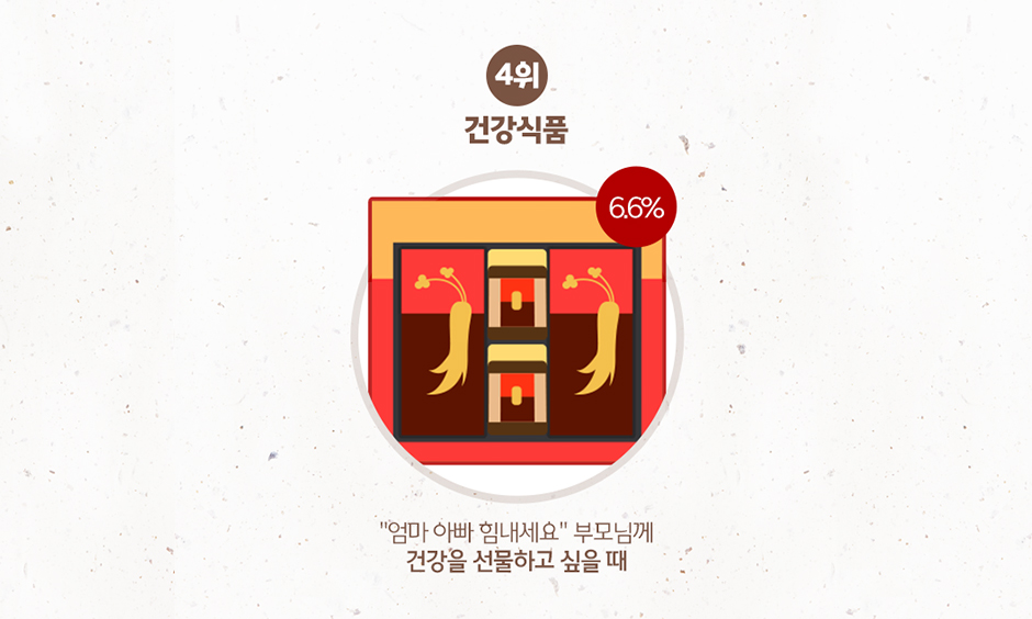 4위는 부동의 효도템, ‘건강식품’입니다. 건강은 건강할 때 챙겨야 하는 법! 부모님의 활력 넘치는 2020년을 위해 건강식품을 선물해보세요. 선물하면서 아프신 곳은 없는지, 요즘 건강 관련 고민은 무엇인지 대화도 나누면 더 좋겠죠?