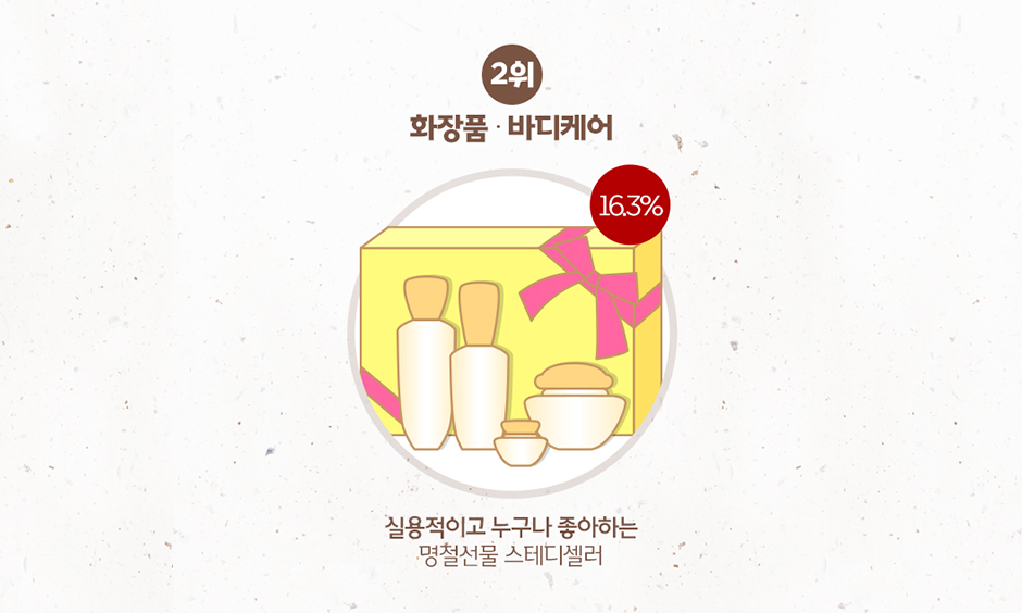 명절 선물 구매 2위는 ‘화장품’입니다. 화장품은 사용하는 사람마다 선호 브랜드가 명확하기 때문에 어떤 브랜드의 제품을 주로 사용하는지 알면, 가장 실패할 확률이 적은 선물이죠. 소모품이다 보니 매년 같은 걸 선물해도 반가워할 아이템이기도 합니다. 화장대 위를 슬쩍 살피고 다 떨어져 가는 제품을 선물한다면 더할 나위 없겠죠?