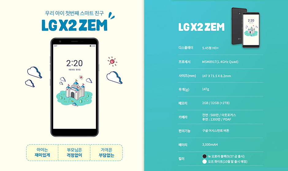 잼(ZEM)의 특장점을 모두 활용할 수 있는 전용 스마트폰도 있습니다. 키즈 전용 스마트폰 ‘LG X2 ZEM’은 가로 71.5mm, 세로 147mm, 두께 8.2mm의 콤팩트한 크기와 147g의 가벼운 무게로 초등학교 저학년도 한 손으로 사용하기에 무리가 없습니다. 모르는 문제를 사진으로 찍어 검색하거나 선생님께 직접 질문할 수 있는 수학 문제풀이 앱 ‘콴다’도 제공됩니다.
