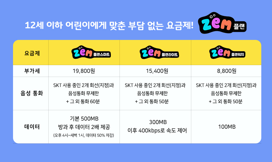 아이와 부모가 즐겁게 스마트폰 라이프를 즐길 수 있는 잼(ZEM). 키즈 요금제 잼(ZEM) 플랜으로 더 알차게 즐겨보세요. 잼(ZEM) 플랜은 음성통화와 데이터량에 따라 ‘플랜스마트’, ‘플랜라이트’, ‘플랜 워치’로 나뉩니다. 주로 통화하는 사람을 지정 회선으로 등록하면 무제한으로 음성통화를 할 수 있습니다. 플랜 스마트는 어린이 고객이 스마트폰을 주로 사용하는 시간 대인 방과 후(오후 4시~ 새벽 1시)에는 데이터를 2배 제공합니다.