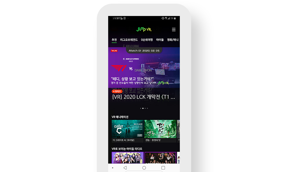 막바지 한파가 찾아온 2월 5일, LoL(리그 오브 레전드) 2020 시즌이 시작됐습니다. 대장정의 첫 관문, LCK(리그 오브 레전드 챔피언스 코리아) 스프링 개막전이 열렸는데요. 올해 LCK는 신종 코로나바이러스의 여파로 무기한 무관중으로 진행됩니다. 직관을 가지 못해 아쉬운 분들을 위해, SKT가 ICT 기술로 현장의 생생함을 전합니다. 바로, Jump VR 앱을 통해 말이죠. 스마트폰에 Jump VR 앱을 다운로드하거나 업데이트한 뒤 즐겨보세요!