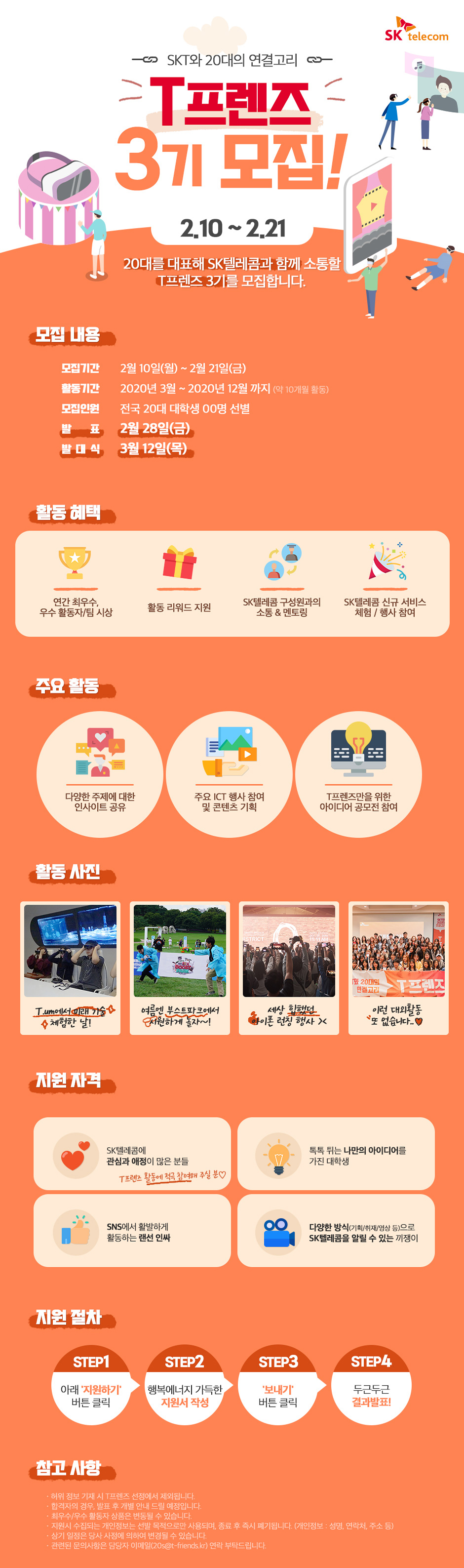 SKT를 좋아하며 SKT를 알아가고 싶은 20대 대학생이라면 누구든 지원할 수 있답니다.