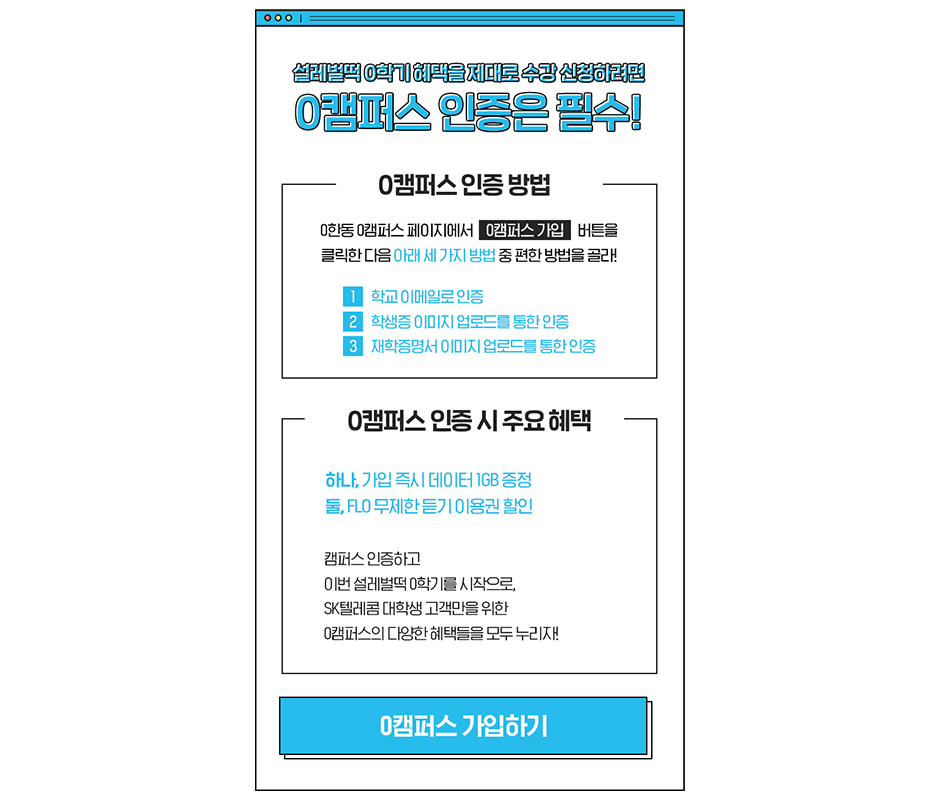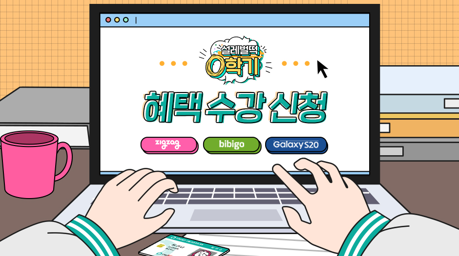 다가오는 신학기, 0 캠퍼스를 사용하는 SKT 고객들이라면 주목해주세요! 본격 설렘 유발 수강 신청 버라이어티 <설레벌떡 0학기 혜택 수강 신청> 이벤트가 있으니까요. 수강 신청만 해도 쇼핑몰 쿠폰을 받을 수 있고, 과목 별로 마련한 퀴즈를 풀면 맛있는 비비고 만두부터 요즘 가장 주목받는 스마트폰 갤럭시 S20까지 받을 수 있다고 하네요! 어떤 과목들이 있는지 살펴볼까요?
