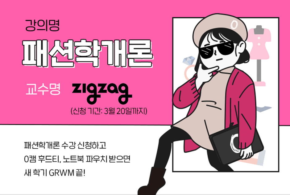 새 옷을 입고 캠퍼스 런웨이를 당당하게 걸어 다니는 일은 개강의 묘미 아닌가요? 캠퍼스 런웨이에서 주목받을 수 있는 아이템과 인싸 스타일링이 궁금하다면 ‘패션학개론’을 수강 신청하세요. 수강 신청을 완료하면 추첨을 통해 여성 쇼핑몰 3,500곳을 한 번에 볼 수 있는 플랫폼 ‘지그재그’의 할인 쿠폰이 지급됩니다. 지그재그에서 캠퍼스 스타일링도 참고하고, 할인쿠폰도 받을 수 있는 기회! 이렇게 좋은 것은 친구에게 알리면 더욱 좋겠죠?