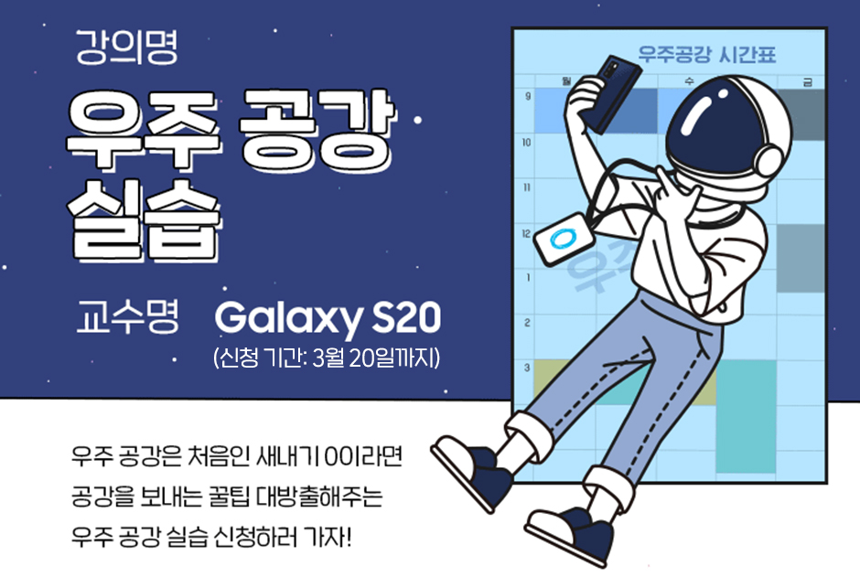 대학교 수강 신청은 선착순인 탓에 타이밍 한번 놓치면 길고 긴 공강 시간이 생기죠. 수강 신청에 실패해서 아무리 긴 공강시간이 생겨도 좌절하지 마세요. 즐거운 공강 시간을 만들어주는 <우주 공강 실습>이 있으니까요. 갤럭시 S20이 공강시간을 재미있게 즐기는 방법을 알려줍니다. 수강 신청을 하면 퀴즈가 나오는데요. 정답을 맞힌 고객들에게 매일 추첨을 통해서 갤럭시 버즈+를 증정하고 있습니다. 참여는 하루에 한 번씩 할 수 있으니 수강 신청 기간 동안 매일 도전해보세요. 신청 기간은 3월 20일까지입니다.