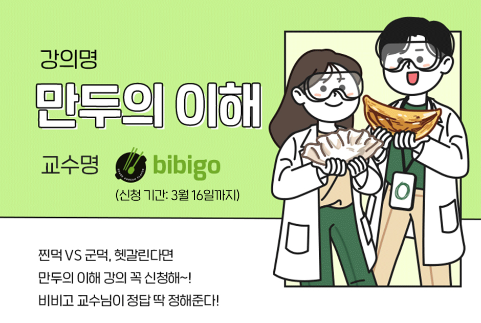 만두가 나고, 내가 곧 만두인 만두 덕후들을 위한 과목이 있습니다. 바로 ‘만두의 이해’. 만두를 좋아하는 사람, 특히 비비고의 모든 만두를 섭렵하고 있는 사람이라면 자신 있게 수강 신청을 권유합니다. 수강 신청을 하고 퀴즈를 풀어서 정답을 맞힌 우등생에게는 매일 추첨을 통해 비비고 만두를 보내줍니다. 당첨되지 않았다고 해서 좌절하지 마세요! 친구에게 공유하면 한 번 더 참여할 수 있는 기회가 주어집니다. 3월 16일까지 수강 신청할 수 있으니 만두의 이해 A+ 받고, 비비고 만두도 함께 받아 가세요!