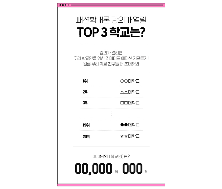 같은 학교 친구들이 많이 참여해 수강 신청 TOP 3 학교에 뽑히면 후디, 노트북 파우치 등 0 캠퍼스 X 지그재그의 스페셜 기프트도 제공됩니다. 3월 20일까지 수강 신청할 수 있고, 무한 광클이 가능하니 친구들에게 공유해서 TOP 3 학교로 고고!