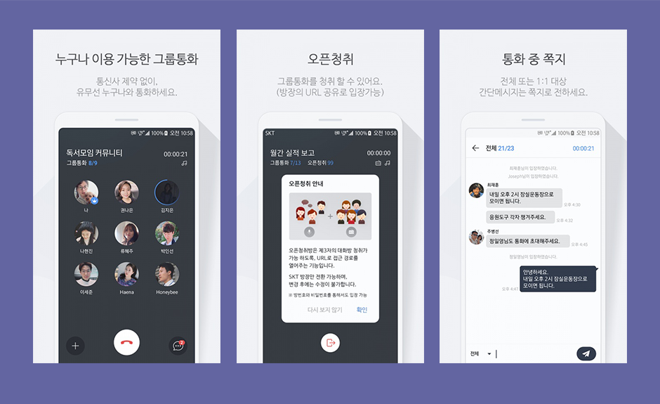 회의는 ‘T그룹통화’ 앱을 이용해 컨퍼런스 콜 방식으로 진행합니다. 스피커폰 주위로 모여 하던 컨콜은 옛말이 된지 오래입니다. 이제 그룹 통화로 각자의 자리에서 마치 1:1처럼 좋은 음질로 통화할 수 있습니다.