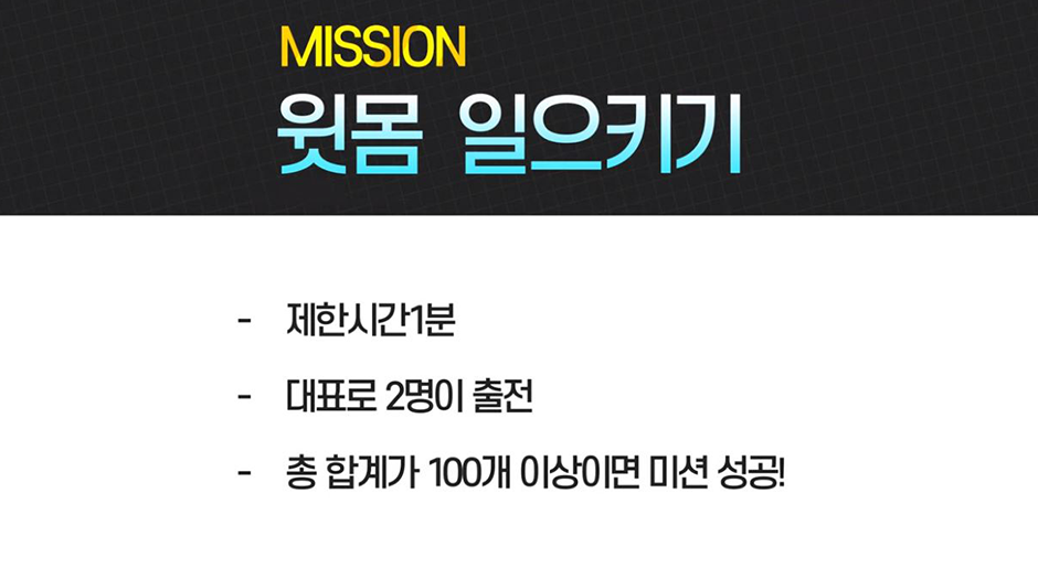 다음 미션은 윗몸 일으키기! 드림팀에서 2명이 출전해 1분 동안 100개 이상 윗몸 일으키기를 하면 성공입니다. 박기량과 조윤정이 미션에 도전했는데요. 과연 두 사람은 사이 좋게 50개씩 나눠 할 수 있을까요?