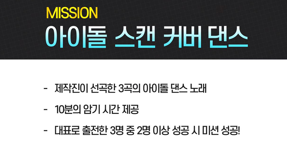 춤으로 둘째가라면 서러울 SK나이츠 치어리더 드림팀. 오늘은 아이돌 댄스곡을 외워볼 텐데요. 춤을 외울 시간은 딱 10분 드려요. 대표로 출전하는 치어리더 3명 가운데 2명 이상이 성공하면 미션 컴플릿! 미션곡은 트와이스의 ‘Fancy’, ITZY의 ‘ICY’, 청하의 ‘스내핑’이 선정됐어요. 어머, 완전 신나는 노래들이잖아요! 드림팀은 어떻게 소화해냈을까요?