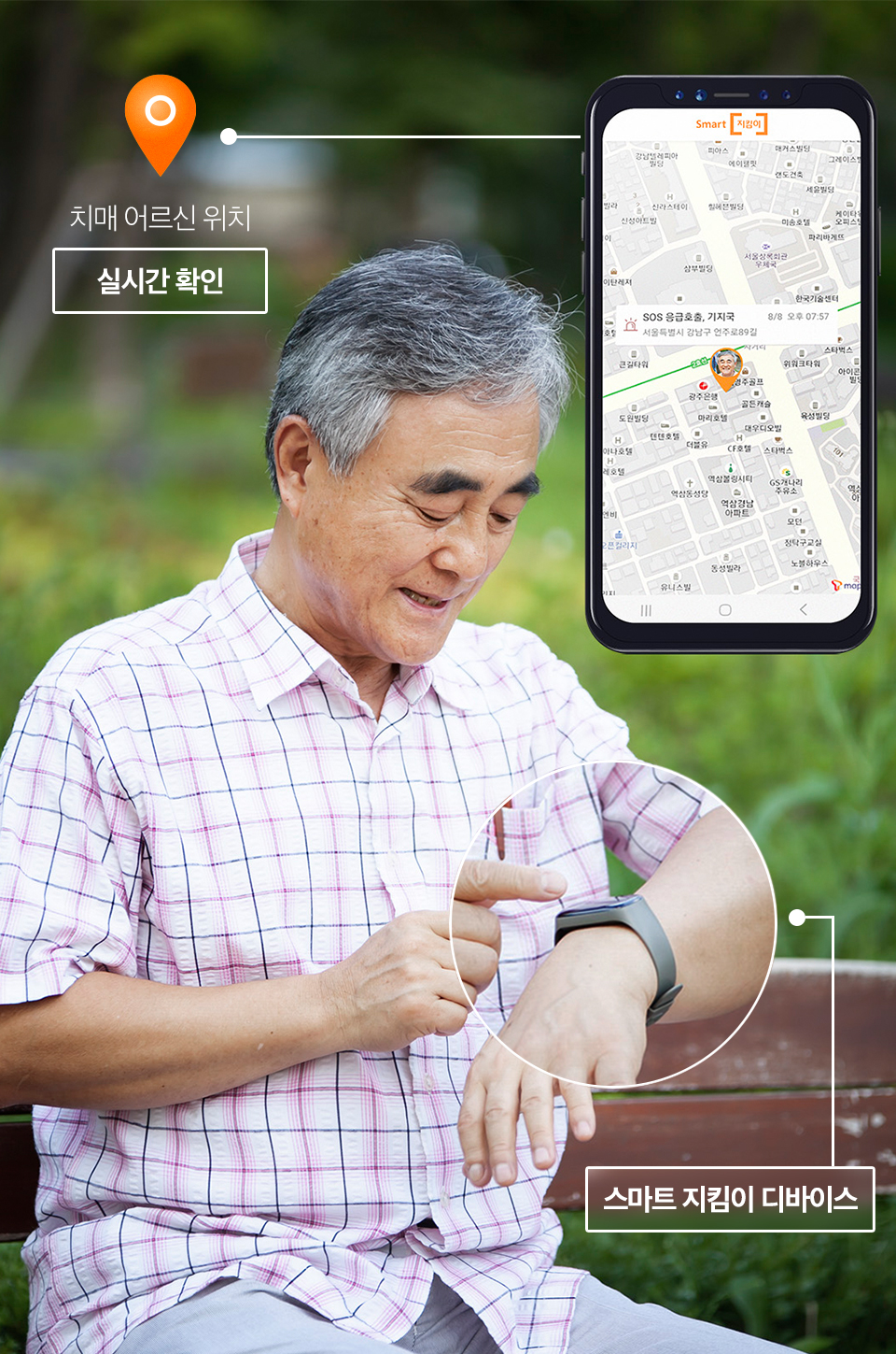 ‘스마트 지킴이’는 사물인터넷 전용망인 로라(LoRa)에 연결되며, GPS기반의 웨어러블 트래커, 전용 애플리케이션, 통합 안전 플랫폼으로 구성되어 있습니다. ‘스마트 지킴이’를 활용하면 보호자가 착용자의 위치를 손쉽게 확인할 수 있어, 실종자 수색에 따르는 개인적∙사회적 부담을 경감시킬 수 있습니다.