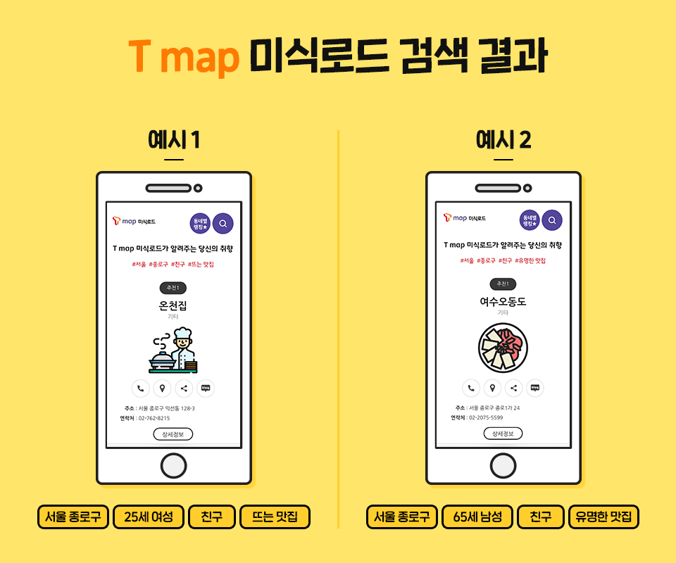 T맵 미식로드에서 서울시 종로구 기준 25세 여성과 65세 남성이 각각 친구와 갈 맛집을 검색해보았습니다. 25세 여성은 ‘요즘 뜨는 맛집’을 옵션으로 선택했습니다. 그 결과 요즘 젊은이들에게 인기가 좋은 1인 샤부샤부 전문점인 ‘온천집’이 추천됐네요. 65세 남성은 ‘유명한 맛집’을 골랐습니다. 구수한 장어탕이 일품인 ‘여수 오동도’가 추천 맛집으로 나오네요. T맵 미식로드와 함께라면 이제 맛집 고르는 수고를 덜 수 있겠네요.