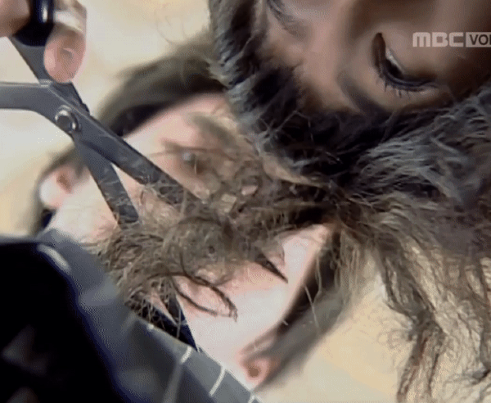 진헌의 등장에 놀란 삼순이. 그 순간 진헌의 재킷 단추에 머리카락이 끼이고 맙니다. 삼순은 머리카락 건들지 말라며 경고합니다. 하지만 피도 눈물도 없는 진헌은 가위를 들어 잘라버리죠. 분노한 삼순은 면접용으로 만든 케이크를 진헌의 얼굴에 냅다 던집니다. 그런데 웬걸, 이거 분위기가 묘합니다.