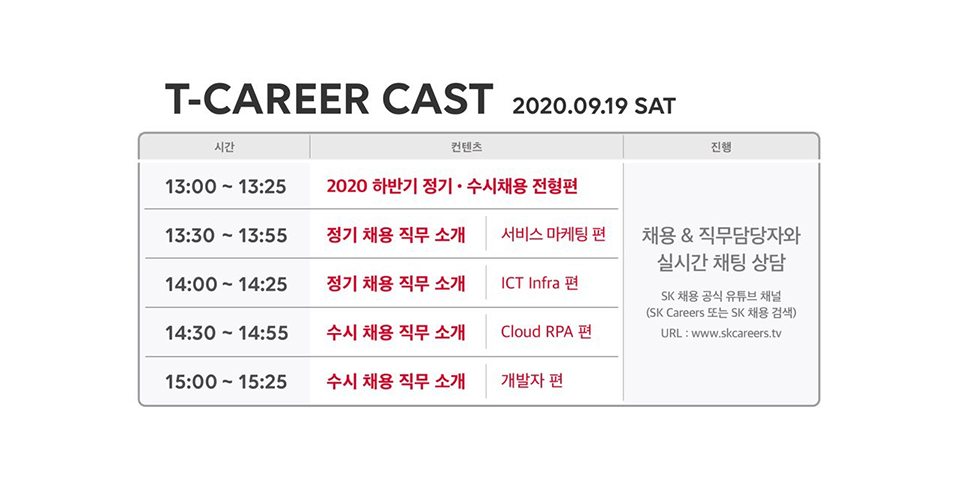 T-Career Cast는 SK그룹 채용 유튜브에서 열리는 온라인 채용설명회입니다. 지원자는 T-Career Cast에서 채용 직무와 전형에 관해 친절한 설명을 들을 수 있는데요. 설명회 진행 중 실시간 채팅과 댓글을 통해 직접 질문을 할 수도 있습니다. T-Career Cast는 9월 19일 오후 1시부터 참여 가능합니다.