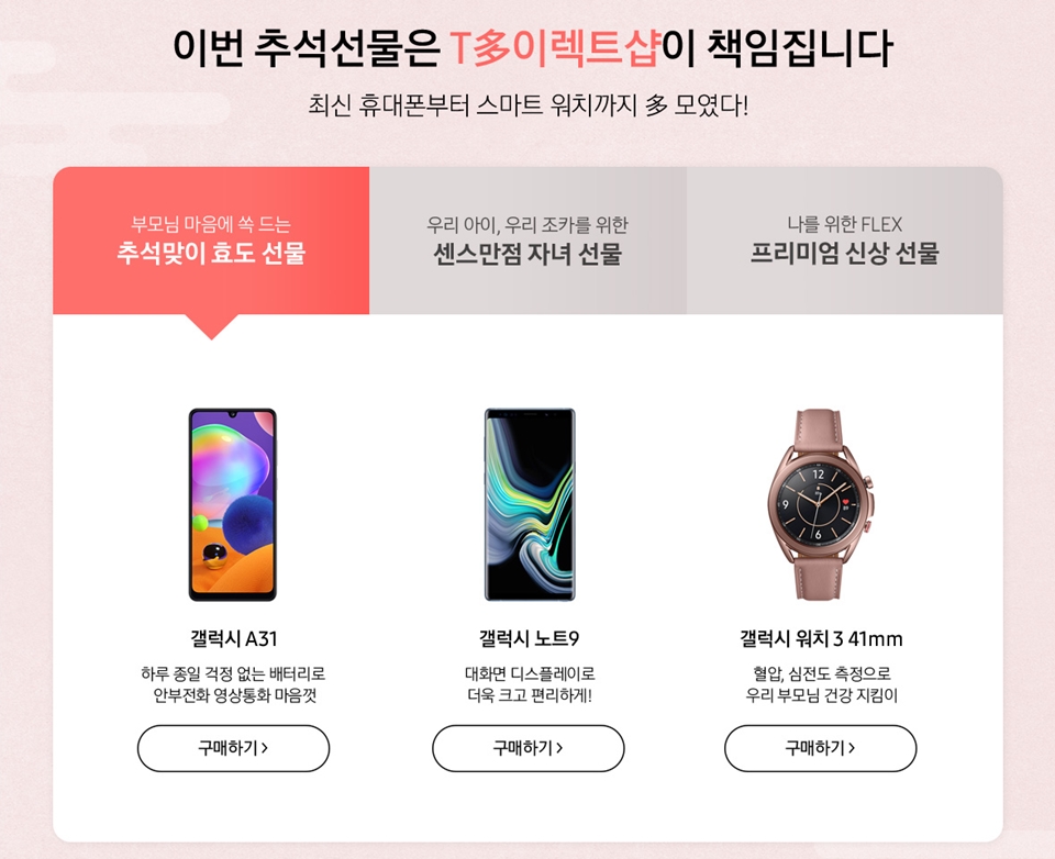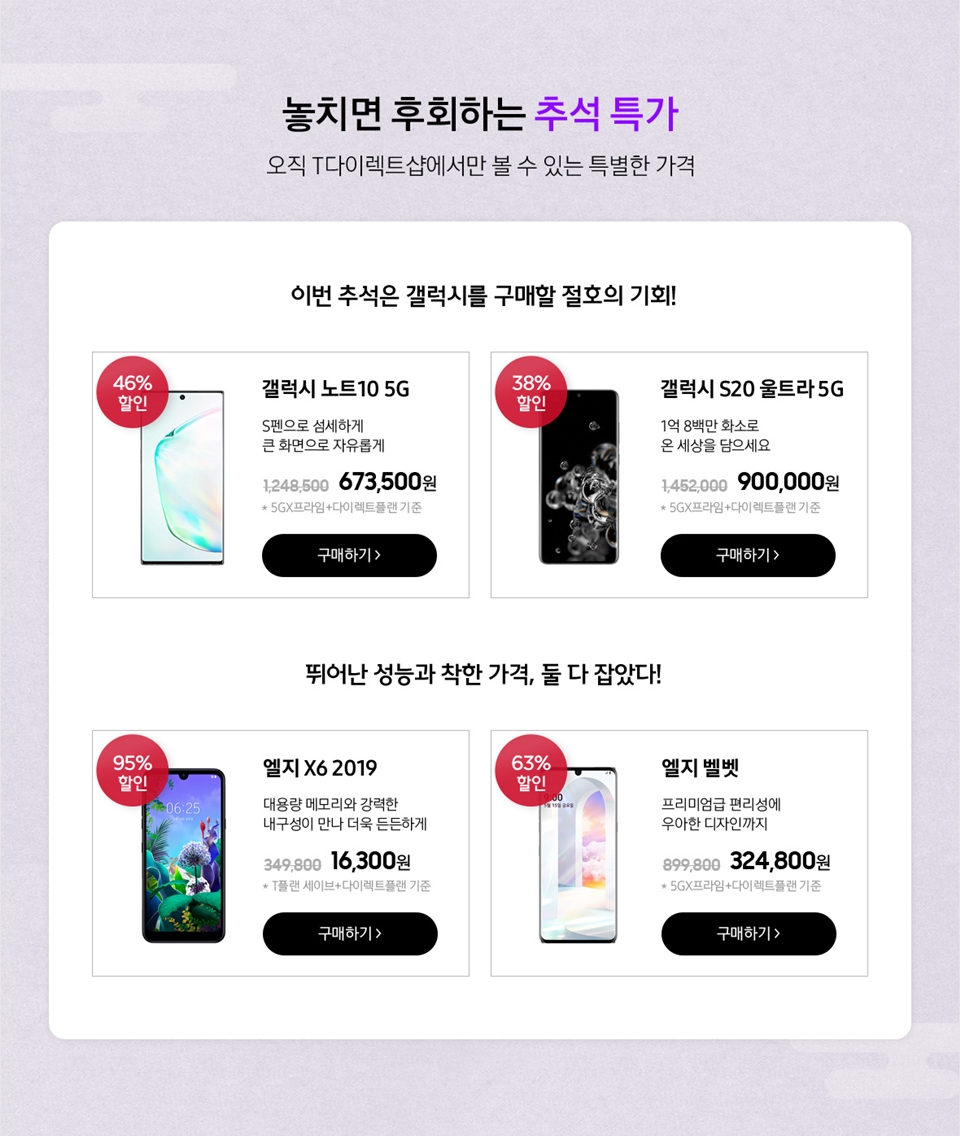 추석 특가로 갤럭시 노트 10 5G, 갤럭시 S20 울트라 5G, 엘지 X6 2019, 엘지 벨벳도 할인 가격으로 만나보실 수 있어요. 온 가족이 즐거워하는 추석인 만큼 효도 선물, 자녀 선물, 나를 위한 선물까지 준비되어 있어요.