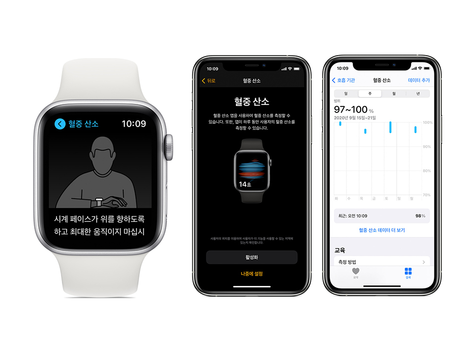 시계 뒷면의 4개 포토 다이오드, 적외선·적색 등 4개 LED(발광다이오드) 클러스터를 이용해 혈액의 반사광을 측정한 뒤 혈액 색깔을 근거로 알고리즘을 이용해 15초 만에 혈중 산소포화도를 측정합니다. 모든 데이터는 건강 앱에서 확인할 수 있습니다. 사용자는 혈중 산소포화도 추이를 시간 경과에 따라 추적할 수 있습니다.