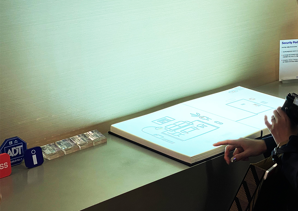 주변으론 SKT ICT 패밀리의 상품·서비스가 가득했습니다. 시큐리티 팟에선 SKT와 ADT 캡스의 보안 서비스를 살펴볼 수 있었죠. 프로젝션 북을 넘길 때마다 보안 서비스가 나타나 백지를 채웠는데요. 화려하고 신기한 기술에 눈이 휘둥그레졌습니다.