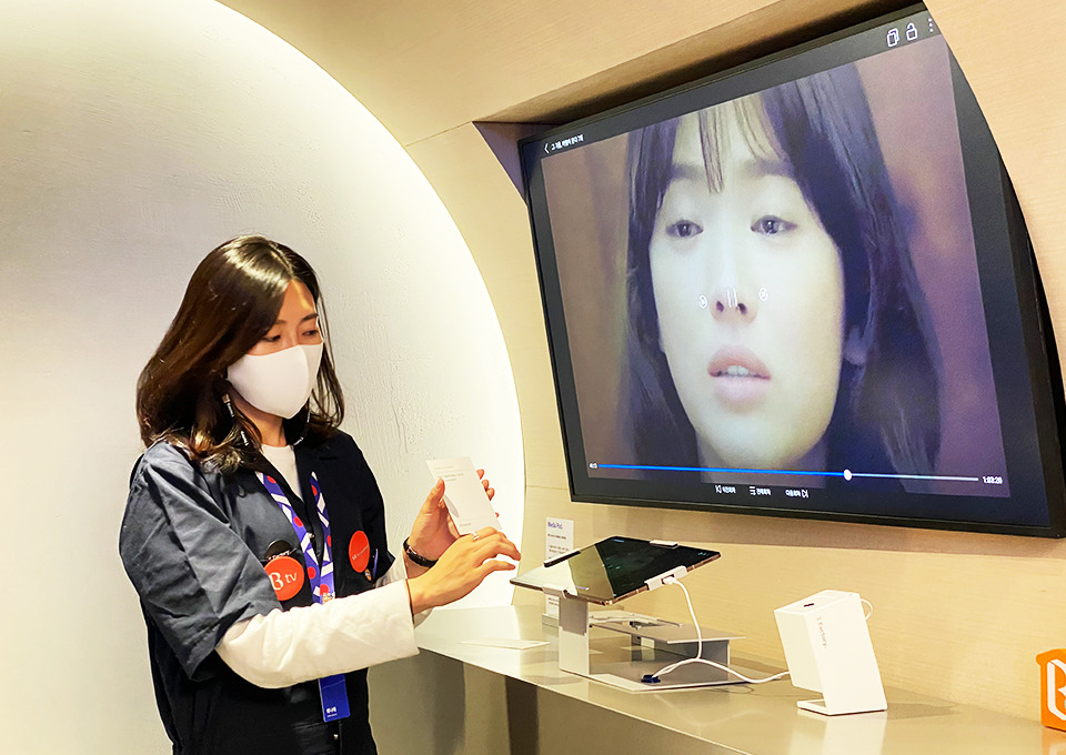 놀라움을 뒤로하고 미디어 팟으로 자리를 옮겼습니다. 드라마·영화 속 명장면을 웨이브, Btv로 볼 수 있는 장소입니다. 명장면 카드를 골라잡아, QR 단말기에 갖다 대니 영상 클립이 재생됐습니다. 명장면 카드는 수십 개가 준비되어 있었는데요. 골라 보는 재미가 쏠쏠했습니다.