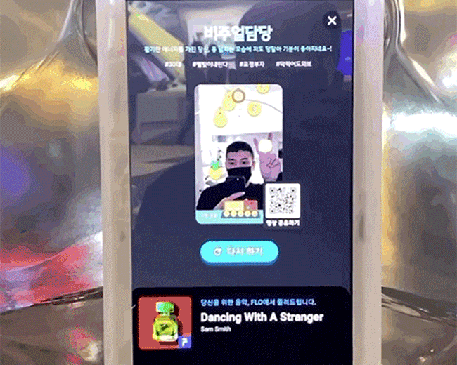AI가 맞춤형 노래를 추천해주는 자이언트 페이스도 흥미로웠습니다. 동작/표정 인식 게임을 즐기는 동안 AI가 내 얼굴을 분석(나이, 성별, 표정 등)하고, 어울리는 노래를 찾아줬는데요. 저는 #30대 #표정부자라는 결과가 나왔습니다. 20대가 뜰 줄 알았는데 귀신같이 알아맞혔네요.