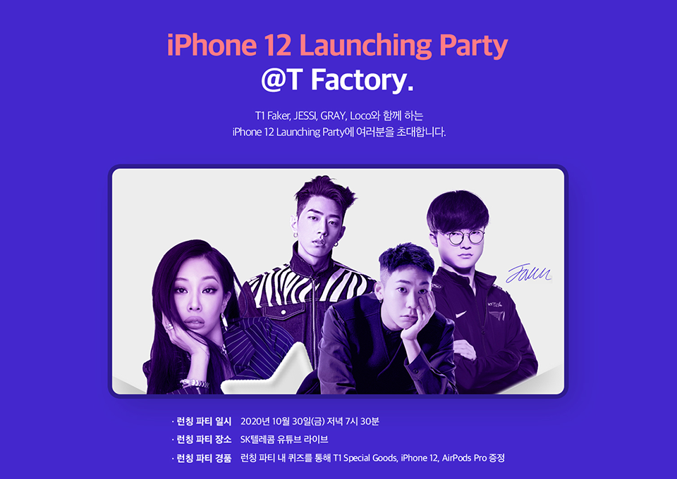 SKT가 MZ 세대를 위한 언택트 아이폰 12 론칭 파티를 개최합니다. 10월 30일 금요일 홍대 T팩토리[관련기사]에 제시, 로꼬, 그레이가 총출동하는데요. 아이폰 12를 낱낱이 살펴보는 시간과 풍성한 경품까지 준비되어 있습니다. 집콕 할로윈 데이를 즐기고 싶다면, 아이폰 12가 너무너무 궁금하다면, 이 시간에 주목해 주세요. 언택트 아이폰 12 론칭 파티에 여러분을 초대합니다.