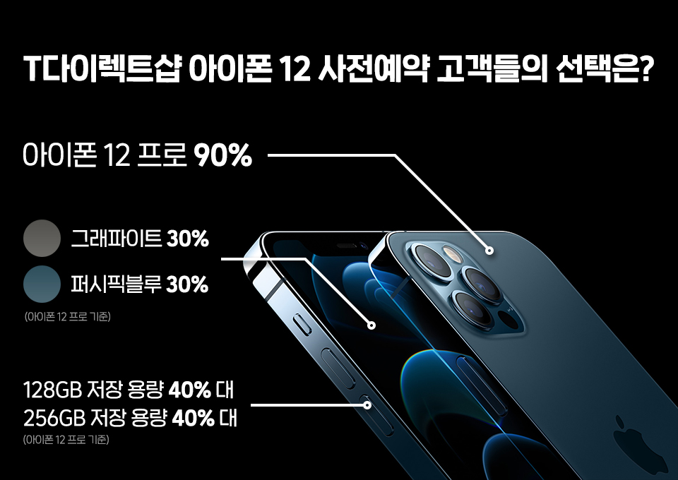 T다이렉트샵 사전예약 결과 20, 30대 여성 비중이 절반을 차지했는데요. 아이폰 12 프로와 아이폰 12의 예약 비중은 9 대 1로 나타났습니다. 아이폰 12 프로가 압도적인 선택을 받았죠.