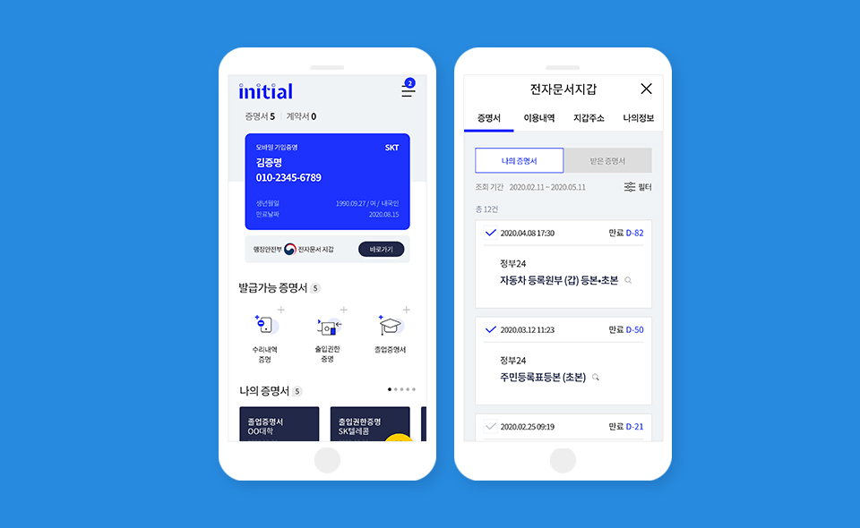 SKT는 이니셜 앱을 통해 전자증명서를 발급하고 유통하는 전자문서지갑 서비스를 출시했습니다. 스마트폰에서 행정안전부 전자증명서 발급·유통 시스템 관련 서비스를 이니셜 앱과 연동해 손쉽게 이용할 수 있습니다.
