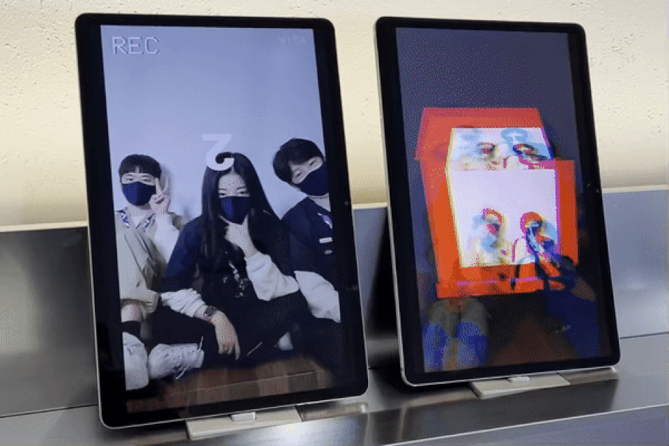 다음 장소는 디렉터스 뷰 촬영존입니다. 디렉터스 뷰는 갤럭시 S21의 카메라를 모두 활용하여 전·후면을 동시에 찍는 기능입니다. 재미난 결과물이 나오기에 SNS 콘텐츠나 숏폼 만들기에 참 좋습니다. T팩토리 갤럭시 스튜디오에는 이 기능을 체험하는 데 최적인 공간이 있습니다.