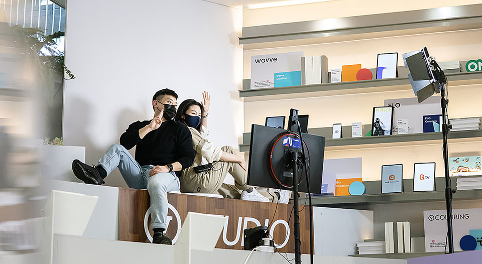 T팩토리 안에는 V 스튜디오도 마련되어 있습니다. V 컬러링 영상을 만드는 곳입니다. V 컬러링이란 SKT가 제공하는 보이는 컬러링 서비스입니다. 나만의 숏폼을 전화 거는 상대에게 보여줄 수 있죠.