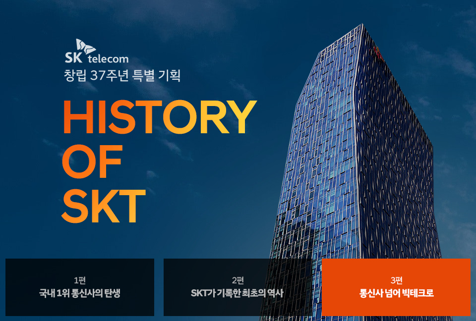 SKT 창립 37주년 특별 기획, 마지막 3편은 부동의 1등 이동통신사를 넘어 빅테크 기업으로, 멈추지 않는 혁신의 역사를 만들어 가고 있는 SKT의 스토리를 소개합니다.
