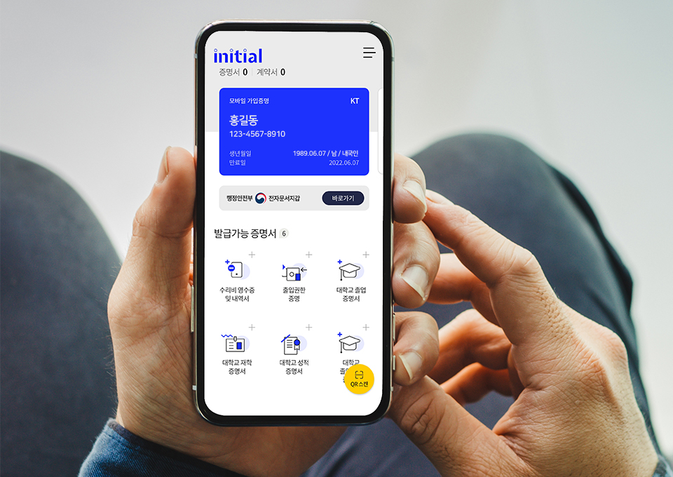 ‘이니셜’은 블록체인 기반 DID (Decentralized Identifier, 분산신원확인) 기술을 활용해 사용자가 본인의 단말에 다양한 증명서를 발급, 저장, 제출하는 서비스입니다. 위∙변조 및 진위 여부 검증 등에 있어 높은 보안성을 갖췄습니다.