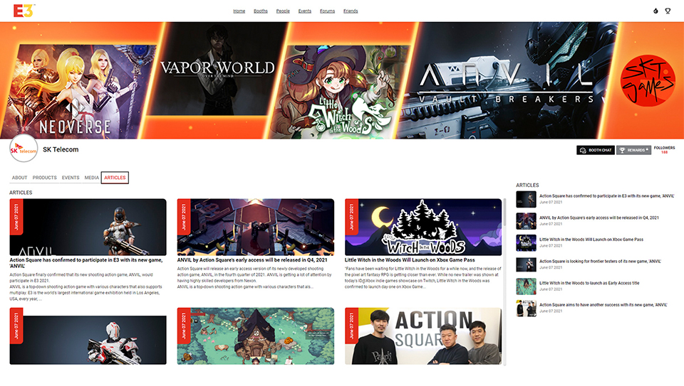 SKT가 이번 E3 2021에서 공개하는 퍼블리싱 게임은 액션 슈팅 게임 ‘앤빌’(액션스퀘어 개발), RPG 게임 ‘숲속의 작은 마녀’(써니사이드업 개발), 액션 어드벤처 게임 ‘베이퍼 월드’(얼라이브 개발), 카드 액션 게임 ‘네오버스’(티노게임즈 개발) 등 4종입니다.