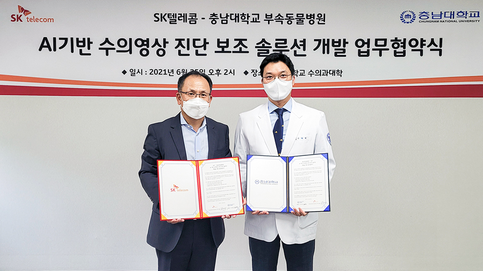 SKT와 충남대학교가 AI 기반 수의용 영상진단 보조 솔루션 개발에 나섭니다. SKT는 국내 동물 영상진단 분야 권위 기관인 충남대학교 수의과대학과 함께 ‘AI 기반 수의 영상진단 보조 솔루션 개발을 위한 MoU’를 체결했습니다. 이 솔루션은 동물을 촬영한 엑스레이를 AI가 판독해 수의사의 진단을 돕습니다. 자세한 소식을 전합니다.