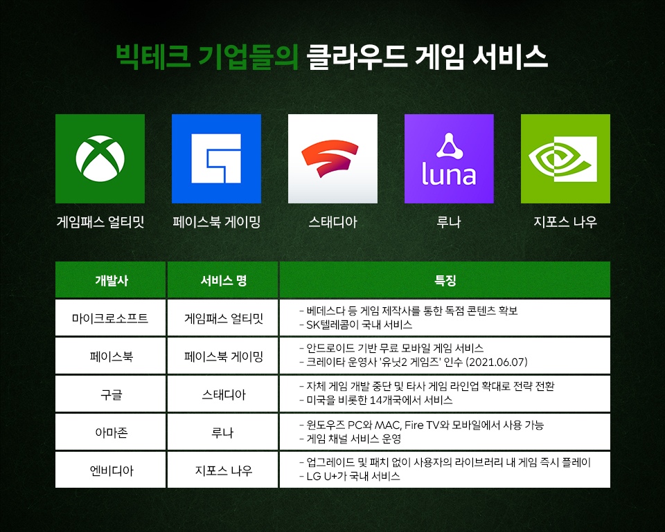 현재 클라우드 게임 시장은 빅테크 기업의 격전지입니다. 그 선두에는 MS의 게임패스 얼티밋이 있습니다. 엔비디아, 구글, 아마존, 페이스북도 잇따라 클라우드 게임 서비스를 선보이고 있습니다.