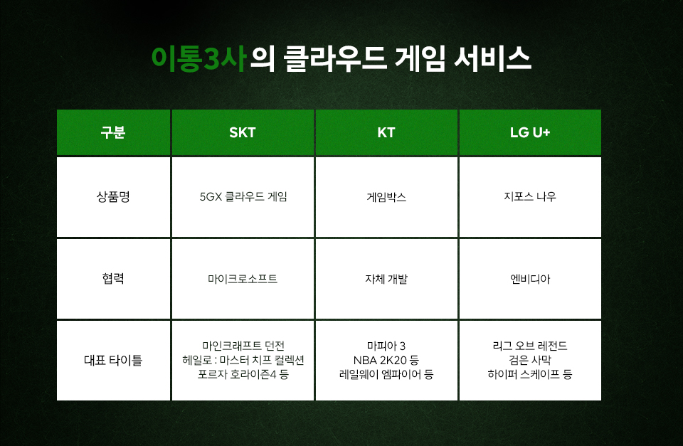 현재 국내 클라우드 게임 시장은 이동통신 3사가 주도하고 있습니다. SKT와 LG U+는 각각 MS와 엔비디아와 협력해 클라우드 게임 서비스를 제공하고 있고, KT는 자체 개발한 게임박스 서비스를 전개하고 있습니다. 5G 킬러 콘텐츠로 급부상한 ‘클라우드 게임’ 시장을 선점하기 위한 경쟁은 그 어느 때보다 치열합니다.