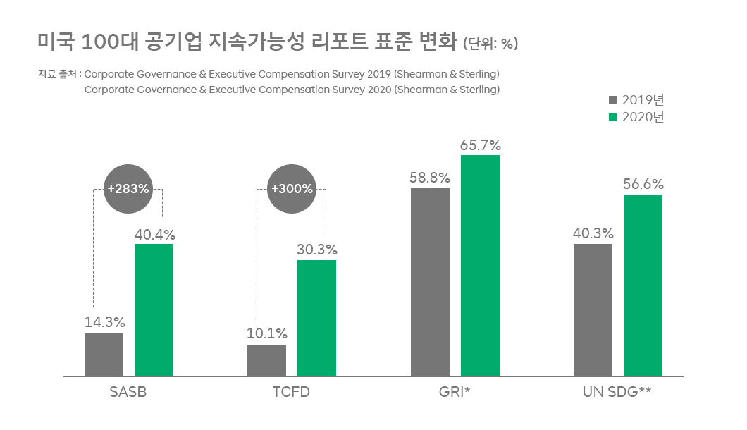 이러한 흐름에 발맞춰 최근 ESG 지표 중 SASB4), TCFD5)가 집중 부상하고 있습니다. 미국 100대 공기업의 지속가능성 보고서를 분석한 결과, 2020년에 전년 대비 SASB와 TCFD 표준을 채택한 기업은 2.8배와 3배로 늘어났습니다.