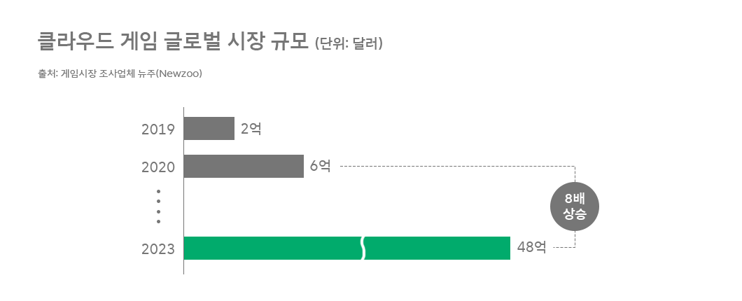 게임시장 조사업체 뉴주(Newzoo)는 2023년 글로벌 클라우드 게임 시장 규모를 48억 달러로 예상했다. 이는 지난해 대비 8배나 늘어난 수준이다. 뉴주의 이러한 전망은 코로나19 확산도 영향을 미쳤다. 게임 유저들이 집에 머물면서 콘솔·PC·모바일게임 외에 클라우드 게임으로도 눈을 돌리기 시작했다는 분석이다.