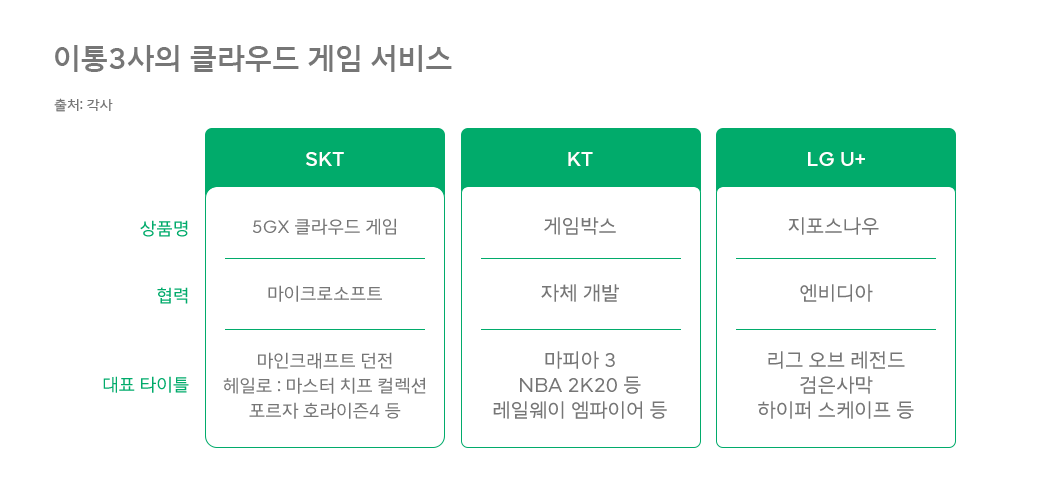 현재 국내 클라우드 게임 시장은 이동통신 3사가 주도하고 있다. SKT와 LG U+는 각각 MS와 엔비디아와 협력해 클라우드 게임 서비스를 제공하고 있고, KT는 자체 개발한 게임박스 서비스를 전개하고 있다. 5G 킬러 콘텐츠로 급부상한 ‘클라우드 게임’ 시장을 선점하기 위한 경쟁은 그 어느 때보다 치열하다.