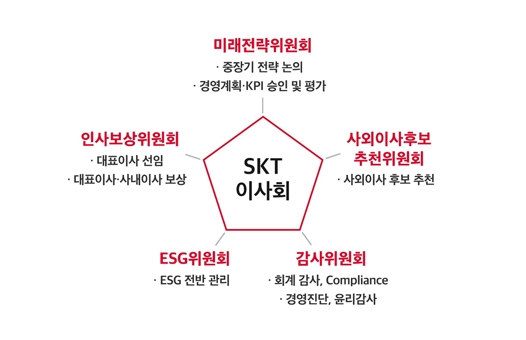 SK텔레콤은 27일 이사회 소위원회를 미래전략, 인사보상, 사외이사후보추천, ESG, 감사를 담당하는 5대 위원회로 개편 및 강화했다.