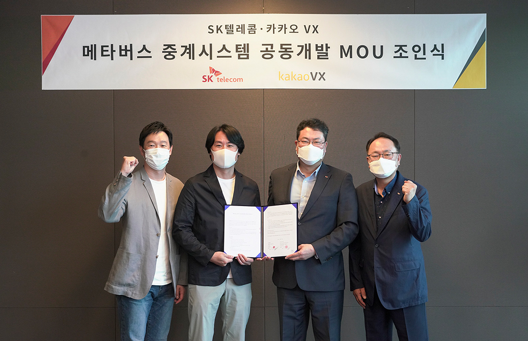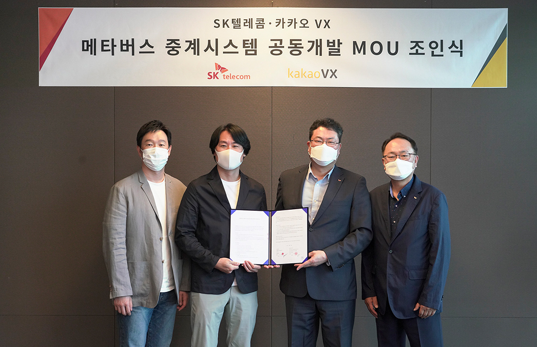 (왼쪽부터) 카카오 VX 이상원 그룹장, 이종석 이사, SKT 이재광 미디어사업지원그룹장, 오경식 스포츠마케팅그룹장이 참석해 협약 체결
