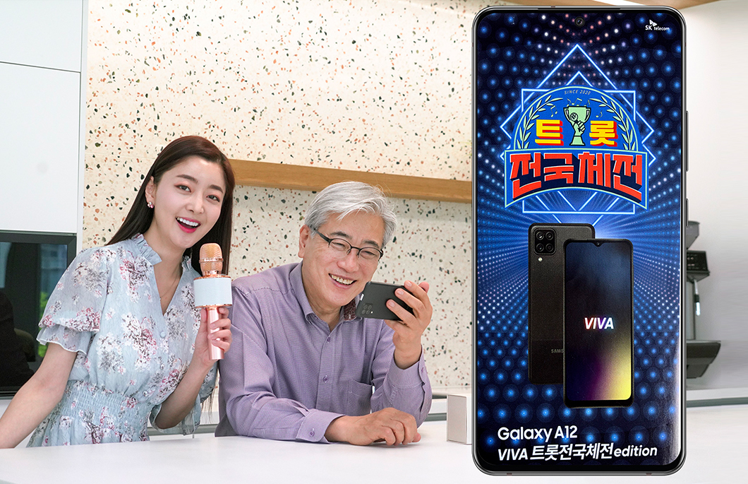 SK텔레콤(대표이사 박정호, www.sktelecom.com)은 KBS의 인기프로그램 ‘트롯전국체전’의 음원이 탑재된 시니어 전용 휴대폰 ‘갤럭시 A12 VIVA 트롯전국체전 edi-tion(이하 A12 VIVA 트롯)’을 7일부터 단독 출시한다고 밝혔다.